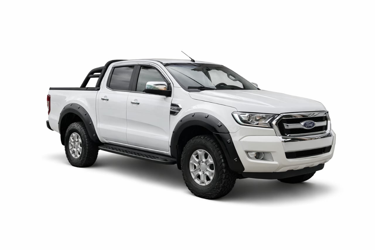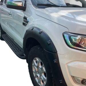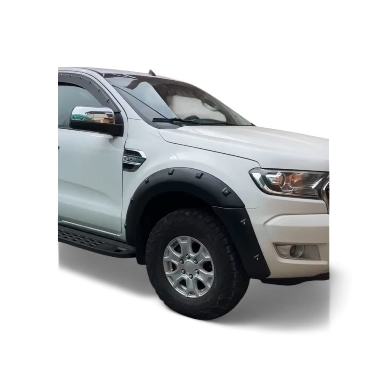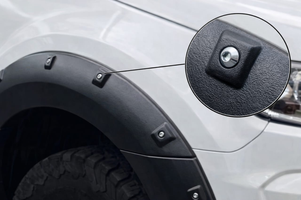 Fangueras estilo militar en HDPE de 3 mm, resistentes y flexibles, con fijación mediante autoperforantes por la parte inferior y pernos decorativos de acero inoxidable para un look off-road robusto.